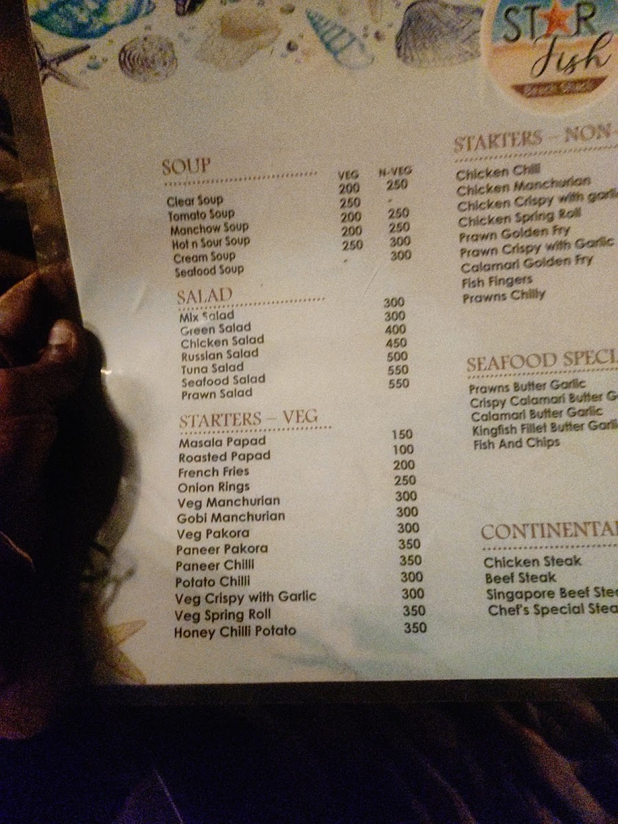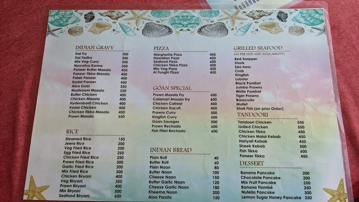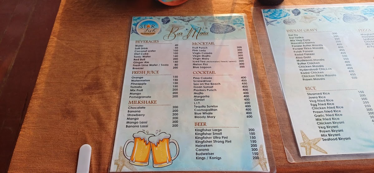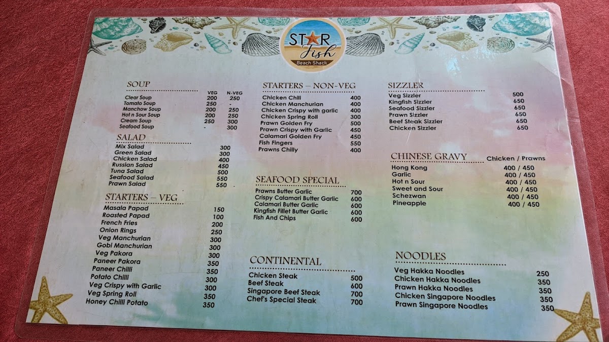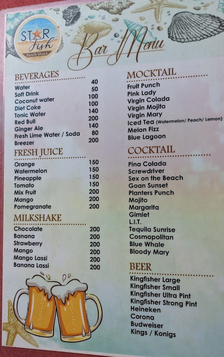 The menu at Star Fish Beach Shack offers a relaxed blend of fresh, coastal flavors and comforting favorites, perfect for a laid-back day by the sea. You’ll find a balance of simple seafood dishes, casual bites, and refreshing drinks designed to complement the breezy, open-air setting right on Arossim Beach.